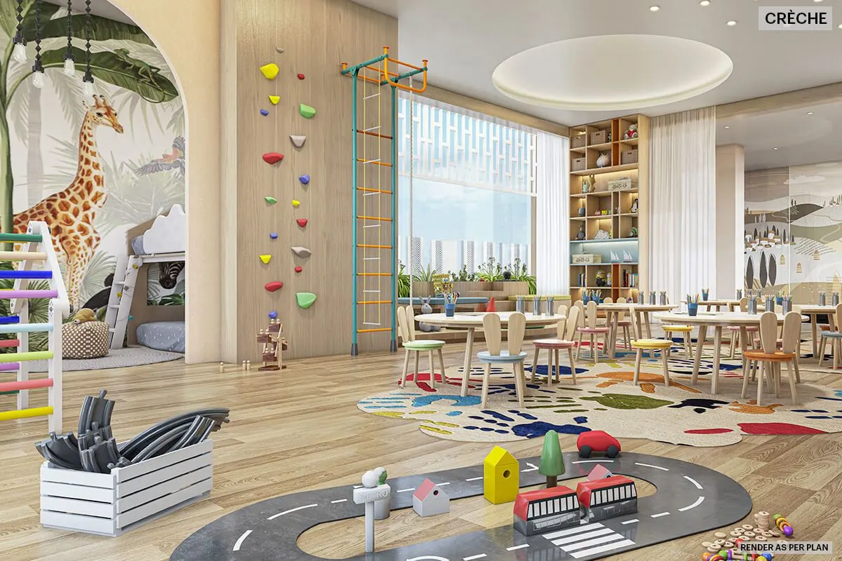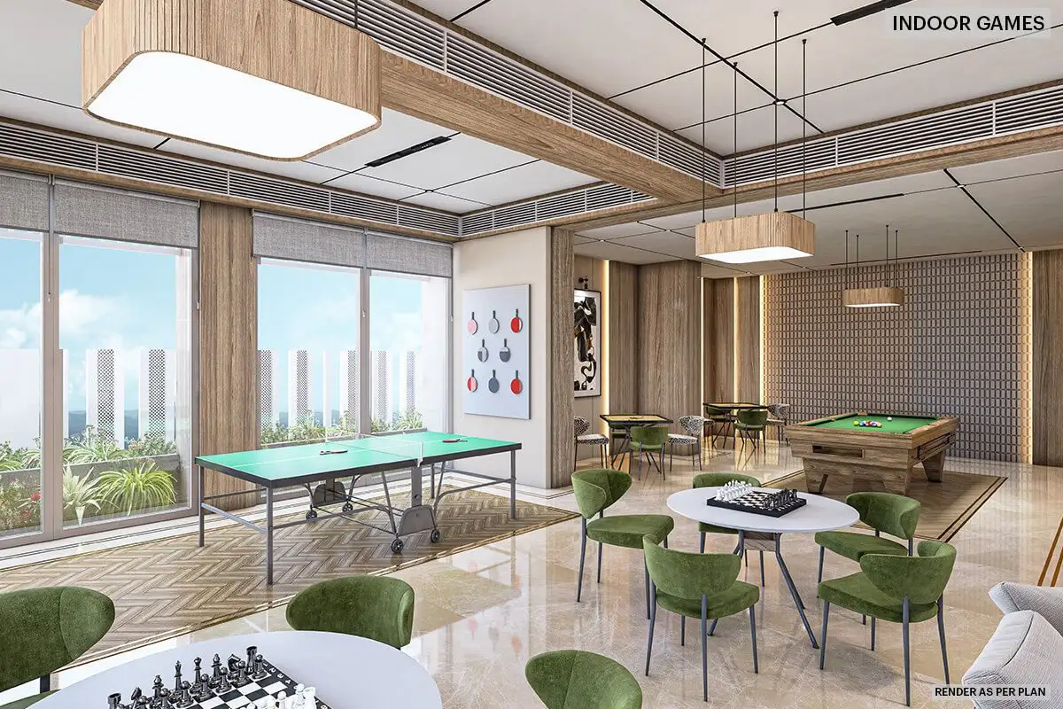 Indoor amenities at this Bangur Nagar redevelopment project focus on fitness, recreation and daily convenience. Dedicated wellness areas, activity spaces and multipurpose community zones provide residents with the flexibility to maintain an active lifestyle close to home. Select elevated decks and common areas offer expansive views of the surrounding cityscape and creek, adding a sense of openness to the residential experience.